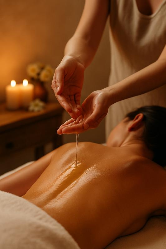 עיסוי עמוק עם שמן חמים. מזין את הרקמות, משחרר מתחים, ומאזן את מערכת העצבים.
